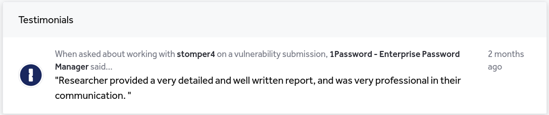 Even though I didn't get a bounty this time, I was grateful to 1Password for the engagement and leaving a public review on my HackerOne Profile.
