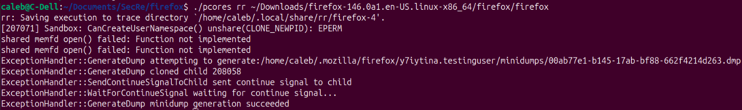 Throughout this project I recorded several instances of the crash, I frequently took breaks and then restarted. I picked up a little trick with rr to jump into the relevant code sections quickly: