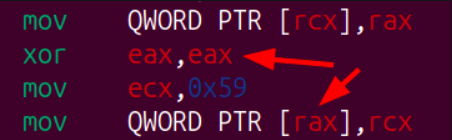 The assembly code clearing the A register, then copying a value to the location stored in the register: