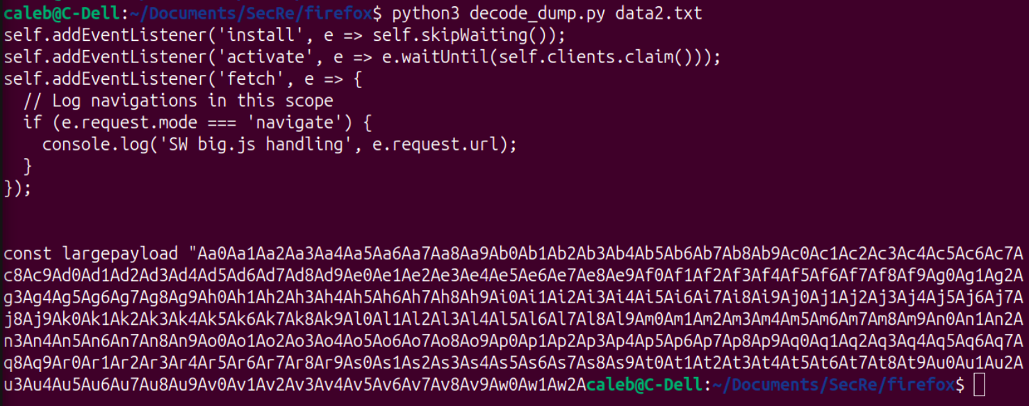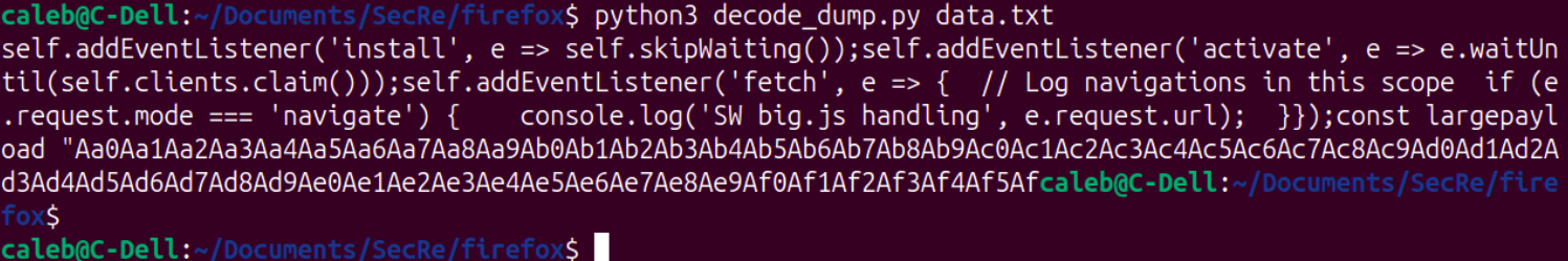 I wrote a small script to remove the addresses and decode the UTF-16 output given by GDB when reading the raw memory values. The following image shows the original service worker, in readable form, taken from the heap using GDB and rr: